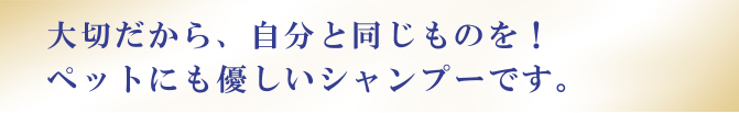 大切なペットだから、良いもので洗いたい! 私たちよりも敏感なペットたち。 匂いも、成分も、安心なものじゃないと私たちも心配です。 エッセンスシャワーは、香料は使わず、やさしく洗い上げる成分でできています。 シャンプーの基本は汚れを落とすこと。その働きに関わっているのが洗浄成分ですから、 髪・頭皮にやさしく、しっかりと汚れを落とす成分が必要となります。 エッセンスシャワーは、有効成分はもちろん、洗浄成分にもこだわった美容系シャンプーです。 だから、ペットにも安心して使えます。 |